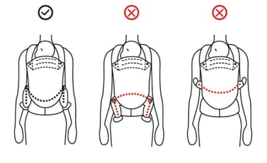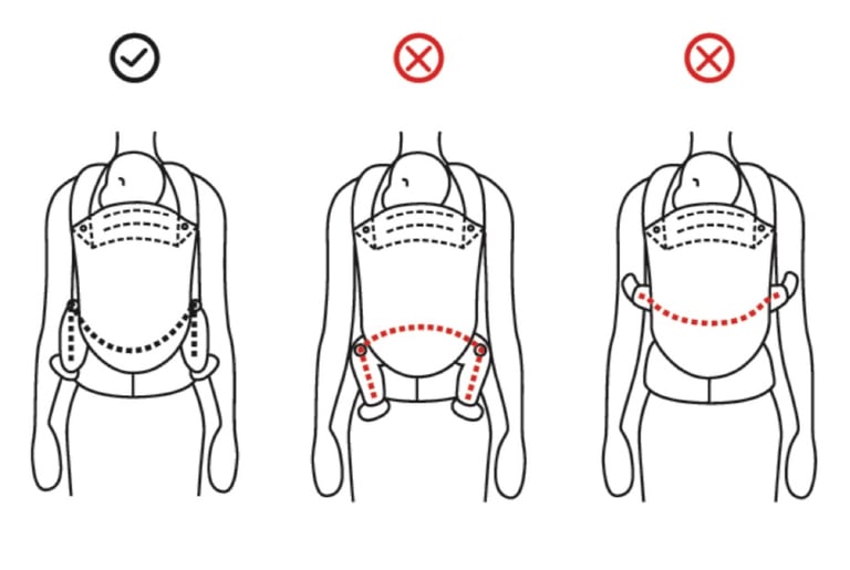 Finding the Correct Position for Your Baby When adjusting the body panel's sizing, always check to see if your baby's knees are higher than his/her thighs, making an 'M' shape as shown below.